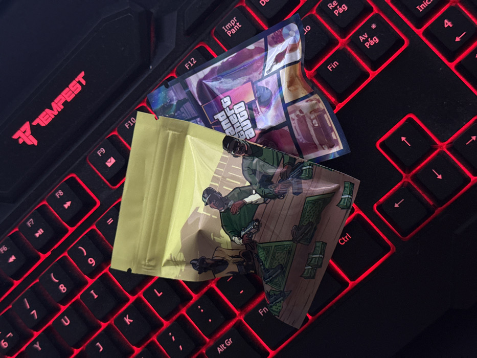 Two small, sealed pouches are depicted resting on a black mechanical keyboard with red backlighting. The keyboard's upper right corner displays the "TEMPEST" brand logo. The left pouch is yellow/tan and features a cartoon-style illustration of three male figures, characteristic of the Grand Theft Auto video game series, seated at a table with firearms and stacks of currency. The right pouch is iridescent and prominently displays the "Grand Theft Auto" logo, along with various images including vehicles and urban elements. The items are positioned on the keyboard, which occupies the entire visible background, suggesting an indoor environment. No individuals are present, and no actions or interactions are occurring. The image does not provide any information to determine its specific location within the city of Yaiza, Spain.