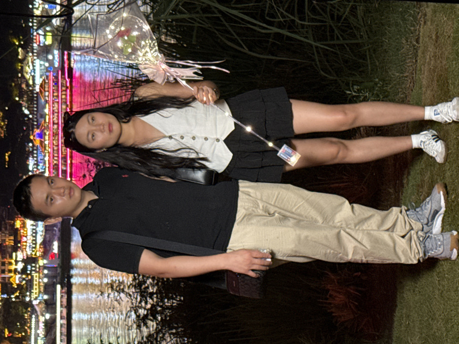 Two individuals, one male and one female, are depicted standing side-by-side on a grassy embankment at night, with a brightly lit cityscape and illuminated boat visible across a body of water in the background. The location is 江北城街道, China. The male, positioned on the left, is East Asian with short dark hair and a neutral expression. He wears a black short-sleeved polo shirt with a red emblem on the left chest, light khaki trousers, and grey and white sneakers with brown soles. A dark messenger bag with a patterned strap hangs over his right shoulder. His right hand holds a small white object near his hip. The female, positioned on the right, is East Asian with long dark hair, and dark sunglasses resting on her head. She has a neutral expression. She wears a sleeveless white button-up vest over a dark garment, a black pleated mini-skirt, and white sneakers with black stripes. A black shoulder bag is on her left shoulder. Her right hand holds an illuminated bouquet wrapped in clear plastic with a pink ribbon and internal string lights, from which a small glowing rectangular object also hangs. The foreground consists of green grass and tall, dark foliage to both sides. The midground features a dark body of water reflecting the vibrant artificial lights of the distant city and a large, multi-decked vessel illuminated predominantly in pink and yellow, positioned on the water. The background is dominated by a dense array of illuminated buildings, creating a vivid nocturnal skyline.