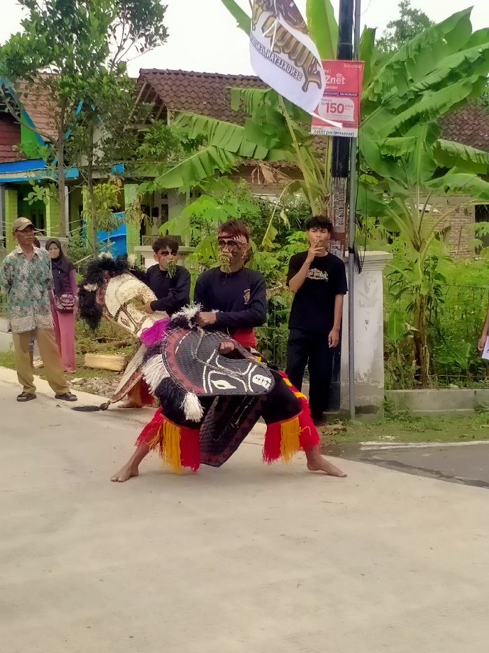 A cultural performance unfolds on a rural road. The central figure is a performer dressed in a unique, horse-like costume, barefoot and bent low. Behind him stand three individuals in dark clothing, two with foliage-like coverings on their faces, and a young man smoking a cigarette. Two more adults, one in traditional attire, watch from the side. The backdrop includes lush greenery, houses, and a flag or banner attached to a utility pole.