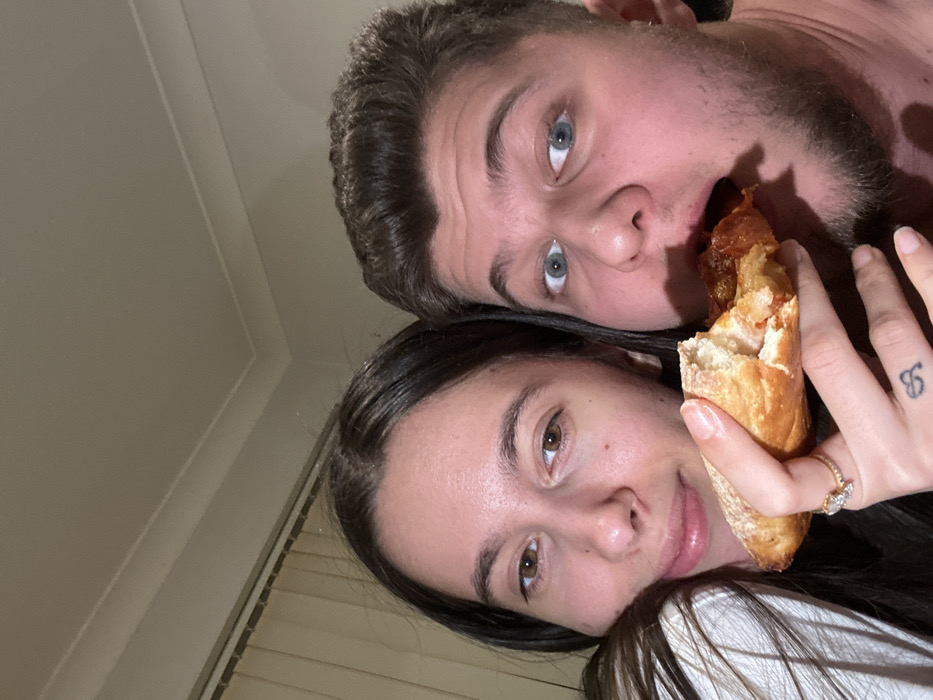 The image depicts two young adults in a close-up, indoor setting, identified as Corby, United Kingdom. A female, positioned on the left, has dark hair, a light complexion, and brown eyes. She wears a light-colored top, and a gold-colored ring with a prominent stone is visible on her left ring finger. A small black, stylized tattoo is present on her left index finger. She holds a section of a crusty bread roll, filled with a reddish, saucy mixture, in front of both subjects. A male, on the right, has dark hair, a light complexion, blue eyes, and facial stubble/beard. His mouth is open, actively consuming the food item held by the female. Both individuals look towards the camera; the male's gaze is direct with wide eyes, while the female's is slightly less direct with a faint smile. The background is a plain light-colored wall with a ceiling molding and a partial view of vertical blinds on the left, indicating a window. Illumination is artificial and appears dim.