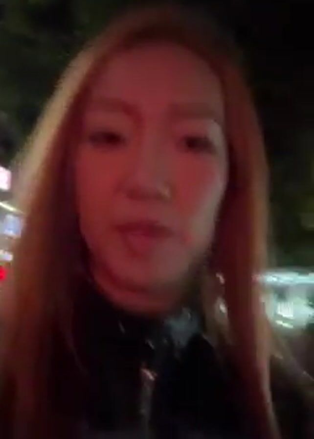woman with long, straight, light brown hair standing outside at night. She wears a black jacket with a fuzzy collar and long, sharp, artificial fingernails. She holds a gift in a dark box with green trim. She is speaking, stating that she is going out to meet her friend and give her a gift. The lighting is dim and appears to be coming from streetlights, giving the scene a red hue. Cars pass in the background.