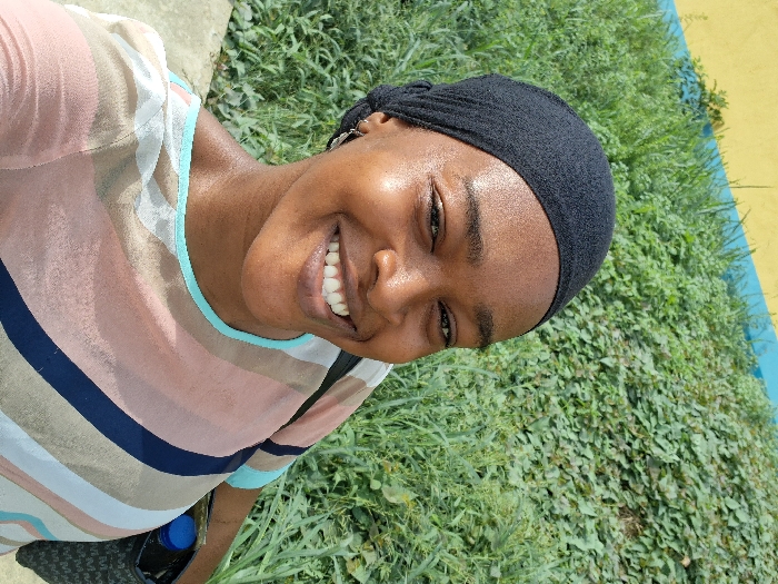 A female subject, appearing to be an adult, is depicted from the upper chest upwards, positioned slightly off-center to the left, smiling broadly with teeth exposed while looking directly towards the camera. Her dark hair is covered by a black, textured headwrap. She wears a multi-striped garment featuring horizontal bands of pale pink, beige, white, and dark blue, with a light blue trim along the neckline. A sheen consistent with perspiration is visible on her forehead. A small, circular, silver-colored earring is present in her visible left ear. On the subject's right side, a black bag with a repeating 'M' monogram pattern is partially visible. Within the bag, a dark-colored plastic bottle with a blue screw cap is discernible. The lower left foreground contains a light-colored, possibly concrete, surface. The background consists of dense green vegetation, including various leafy plants and grasses. Above the vegetation, a painted architectural feature is present, exhibiting a horizontal band of light blue paint surmounted by a horizontal band of yellow paint. The scene is illuminated by bright ambient light. This outdoor setting is consistent with general urban or suburban environments within Lagos, Nigeria, likely adjacent to a building or perimeter wall. Specific geographical markers to pinpoint a precise location in Lagos are absent from the image.