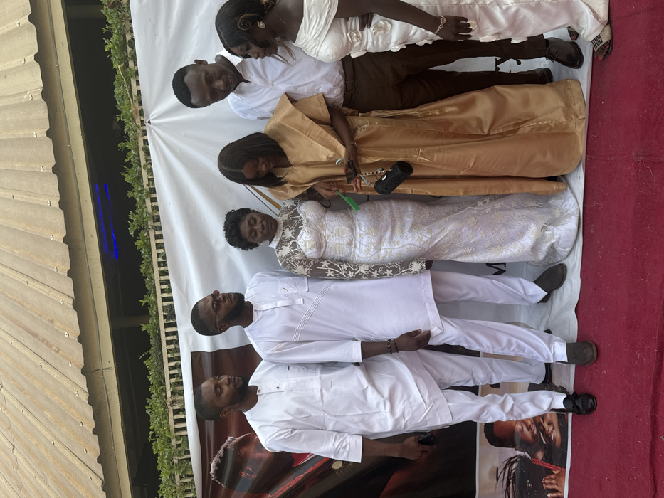 Six individuals are depicted standing on a red carpet in an outdoor setting in Jos, Nigeria, against a large white banner