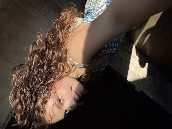 A woman with curly, brown hair looks at the camera in a close-up shot. She has fair skin and is wearing a blue and white patterned top. Her face is turned slightly to the side, and her eyes are open. She has a silver bracelet on her arm and a necklace around her neck. Part of the background is light-colored brick. Sunlight streams in from the side.