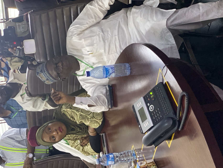 The scene depicts an indoor meeting in Gwagwada, Nigeria, taking place around a large, polished dark brown wooden conference table