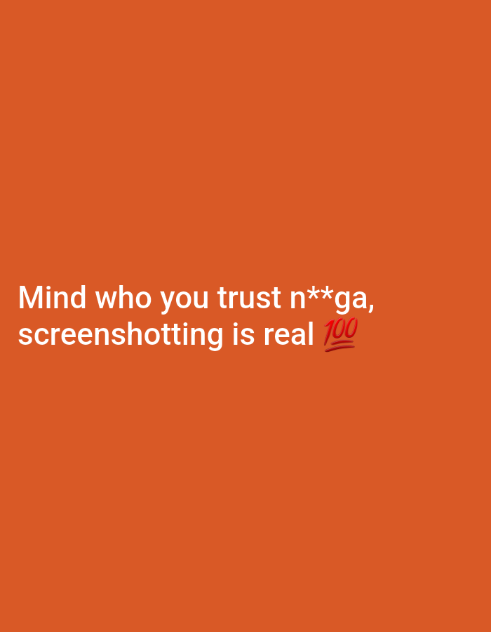An image displays the text "Mind who you trust n**ga, screenshotting is real 💯" against a solid orange background