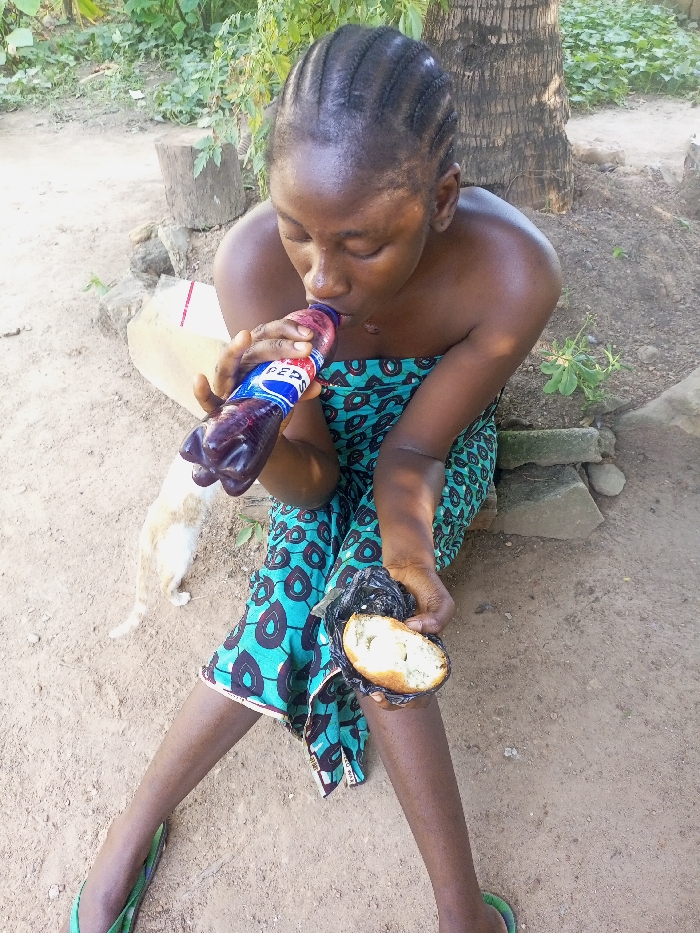 A female individual is depicted outdoors in Akwanga, Nigeria, seated on light brown dirt ground. She wears a teal and black patterned off-shoulder garment and green flip-flops on her left foot. The individual is actively drinking from a clear plastic Pepsi bottle containing a dark red liquid, holding the bottle to her lips with her right hand. In her left hand, she holds a partially consumed round baked good, wrapped in a black plastic bag. To the left and slightly behind her, a cream and orange cat stands on the dirt, facing away from the viewer. The background includes a large tree trunk, green foliage, wooden stumps, and various rocks. The scene is illuminated by natural light.