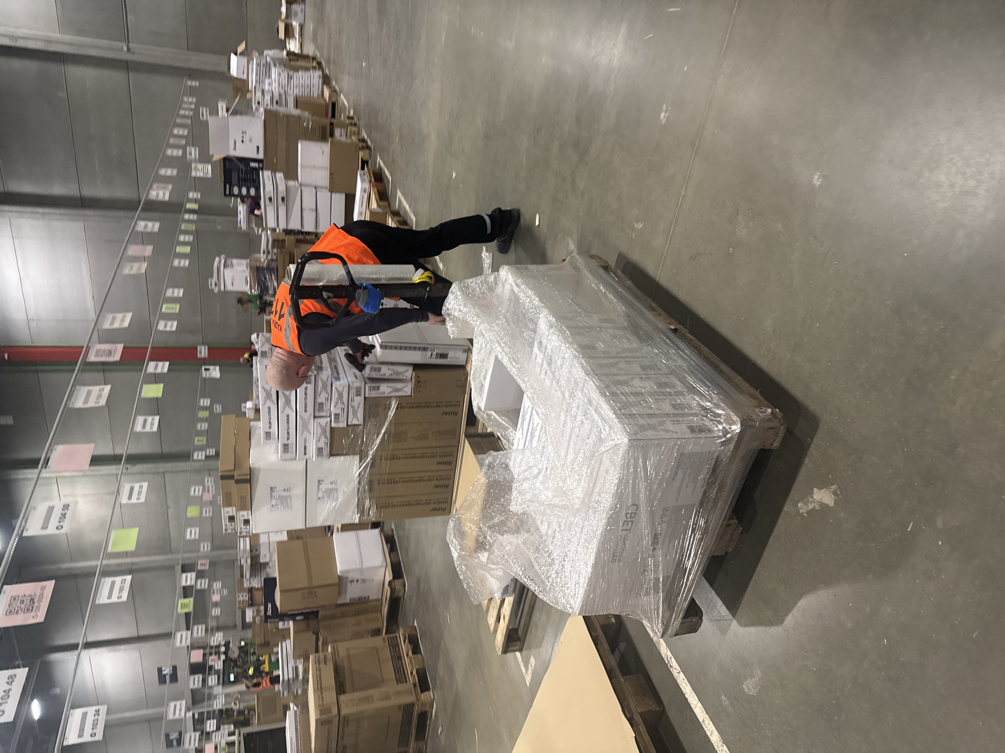 A warehouse worker wearing an orange safety vest and black pants is operating a pallet jack to move a pallet of wrapped boxes