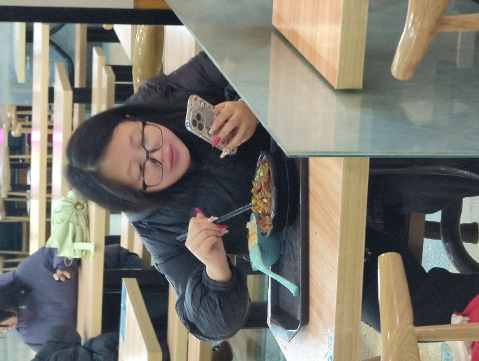 A woman in glasses and a dark jacket sits at a table with a glass top, holding a cell phone. She also holds chopsticks in her other hand, ready to eat from a black bowl with food. A blue spoon rests on the side of the bowl. The table is part of a set with wooden legs. Other diners are in the background, seated on similar wooden chairs. The scene seems to be inside a restaurant.
