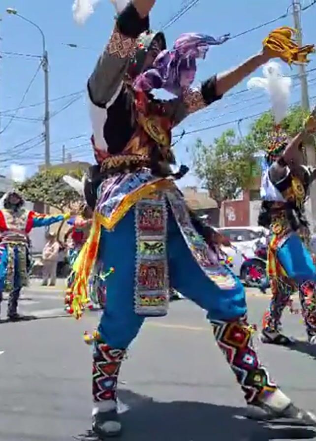 group of people dancing in the street, likely during a parade or festival. They are wearing colorful traditional outfits, including hats with feathers, and some are holding scarves. The dancers move in unison, smiling and appearing joyful. The street is paved, and there are buildings and power lines visible in the background. Several bystanders are watching the performance. The lighting indicates a bright, sunny day.