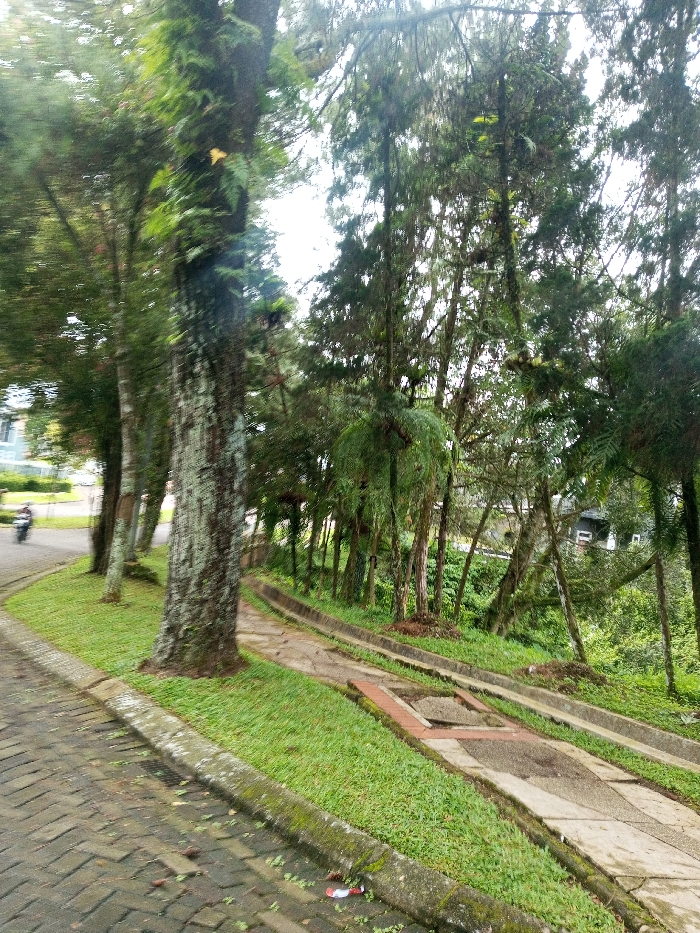 A street view of a road paved with bricks runs alongside a grassy area dotted with trees. A unique concrete pathway with recessed brick portions parallels the grass. The trees vary, with some displaying moss and dense foliage. In the background, glimpses of structures are visible through the trees. A motorcycle is seen in motion on the main road, suggesting a suburban or semi-urban setting.