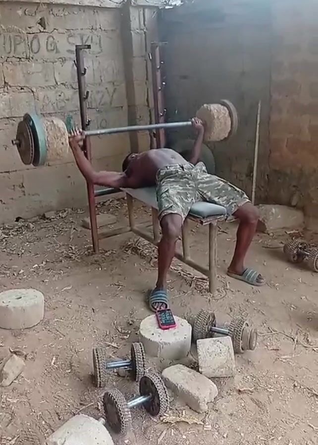 A shirtless man wearing camouflage shorts and sandals is bench-pressing in an outdoor gym. He is lying on a bench and lifting a barbell with makeshift weights on each end. He has a smartphone on a small brick under his feet. The gym is surrounded by a brick wall topped with barbed wire. The floor is dirt, and there are homemade dumbbells and concrete weights scattered around.