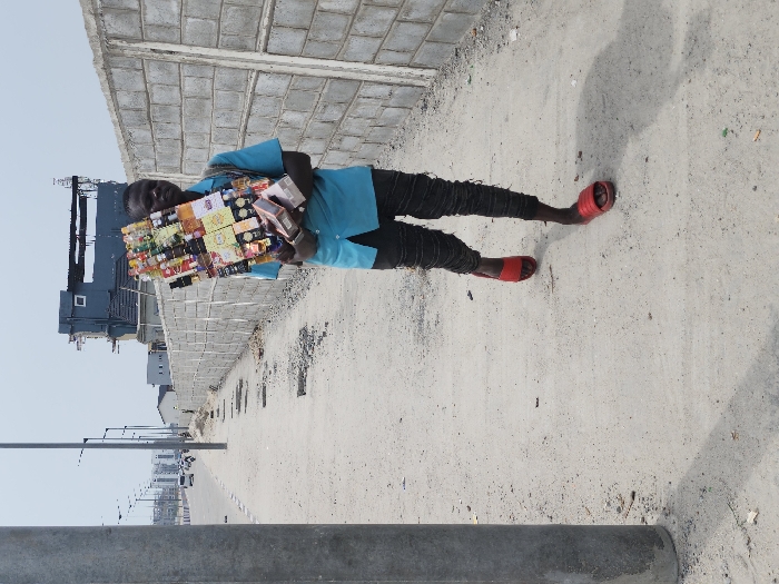 The image captures a daytime scene in Alaguntan, Nigeria, depicting a single male individual walking on an unpaved dirt and gravel path. He is positioned in the center-right of the frame, facing slightly left, wearing a light blue collared shirt, dark ruffled trousers, and red slides. The individual carries a large rectangular display board on his chest, covered with an assortment of consumer goods including bottled beverages and packaged items. Additionally, he holds a stack of small rectangular boxes in his left hand, resting against the display board. To the left, a grey concrete utility pole stands in the foreground, casting a shadow. Adjacent to the path on the left is a paved road with multiple streetlights extending into the distance, where several vehicles are visible. To the right of the path, a grey concrete block wall runs parallel. In the background, a multi-story building with a dark exterior and visible scaffolding is situated behind the wall, under a clear, light blue sky.