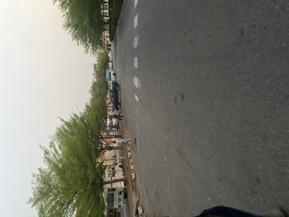 The image depicts a straight, paved road in Lokoja, Nigeria, under a hazy, light gray sky. The road features a visible crosswalk with white block markings near the foreground. Both sides of the thoroughfare are lined with uniformly spaced, green-leafed trees. A raised curb separates the road from a pedestrian area on the left. On the left side of the road, a white mini-bus is parked, facing away from the viewer. Further down, a male individual wearing light-colored clothing stands near the curb, facing towards the right side of the road. Beyond him, a black double-cab pickup truck is parked, facing the viewer, with another male individual in darker clothing standing near its front. Additional vehicles, including other mini-buses, are parked further down the road on the left. Multi-story buildings with light-colored facades are visible in the background on both sides of the road, nestled behind the trees. A partial view of a dark-clad leg and foot is present in the lower-left foreground, suggesting the perspective of the photographer.
