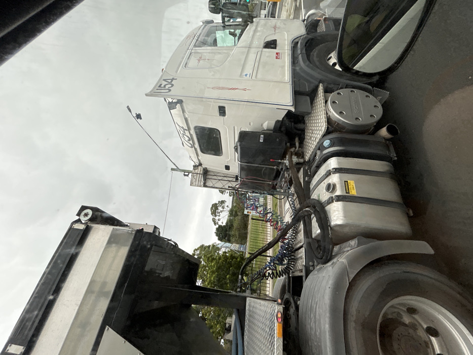 A white semi-trailer truck is parked on the side of the road on a cloudy day. The truck's cab has "U54" printed on the top, and the trailer is raised at an angle. The side of the truck has storage tanks. A small park is in the background. The photo is taken from a low angle, possibly inside a car.
