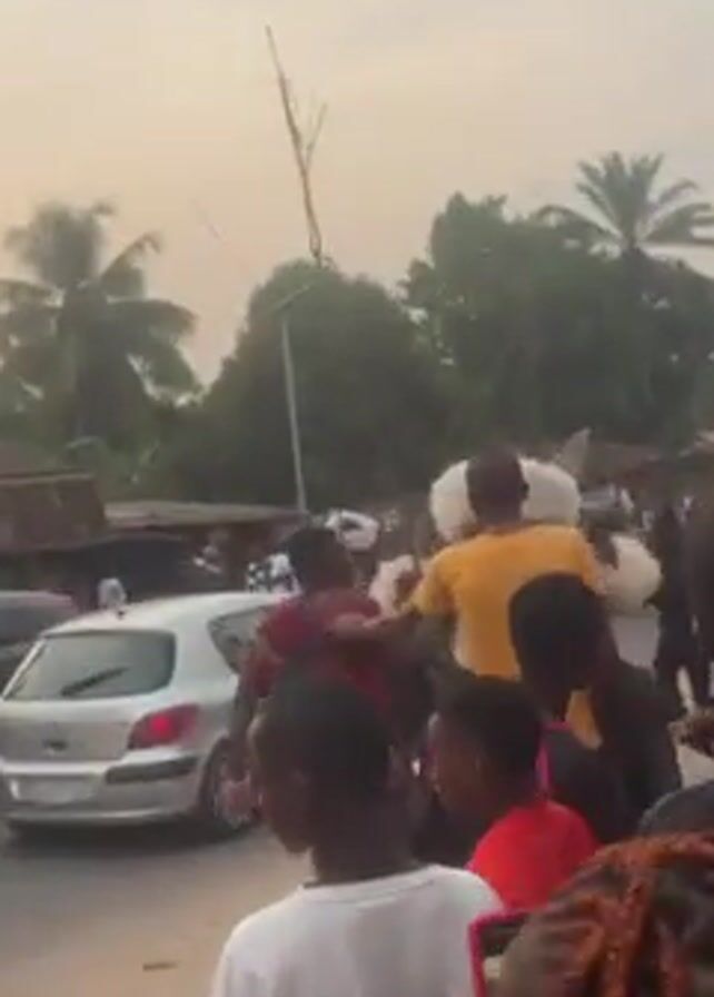 crowd of people on a street in what appears to be a village or small town. There are some cars and a motorcycle parked on the side of the road. Some people are dressed in colorful costumes, possibly for a cultural celebration. One person wears a tall white headdress and other colorful clothes, walking in the street with the crowd. The environment appears to be a rural or semi-rural area, with trees and buildings visible in the background. The lighting suggests it is late afternoon or early evening. A yellow auto rickshaw also drives past.
