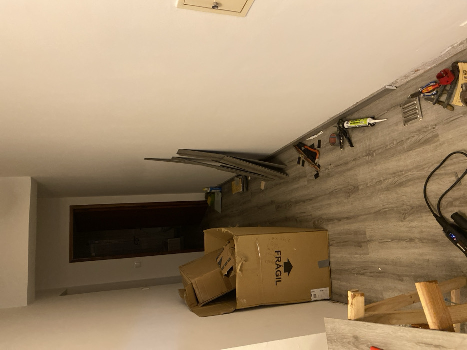A room under renovation. New gray laminate flooring is partially installed. Tools and supplies scattered on the floor: caulk gun, wood pieces, an extension cord, and various hand tools. A large cardboard box labeled "Frágil" sits open, containing smaller boxes. Several flooring planks rest against the wall. A dark recessed area is visible in the distance. The walls are white.