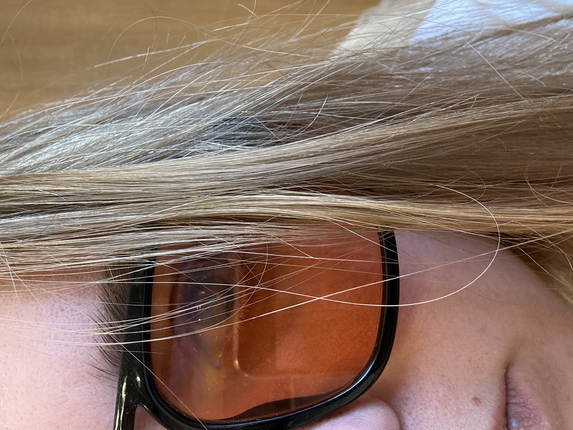A close-up image displays the left side of a person's face. Visible features include fair skin, a dark brown eyebrow, and a portion of the upper lip. A small, dark brown nevus is present on the left cheek, lateral to the philtrum. The person is wearing glasses with thick, black frames and orange-tinted lenses, which obscure the left eye but reveal dark eyelashes. Long, straight, light blonde to light brown hair falls across the right side of the face and over the glasses. The background is uniformly blurred to a warm, light brown or tan color, consistent with an interior setting. The specific location of Ural'skoe, Russia, cannot be determined from the visual evidence presented. No discernible actions or interactions are taking place.