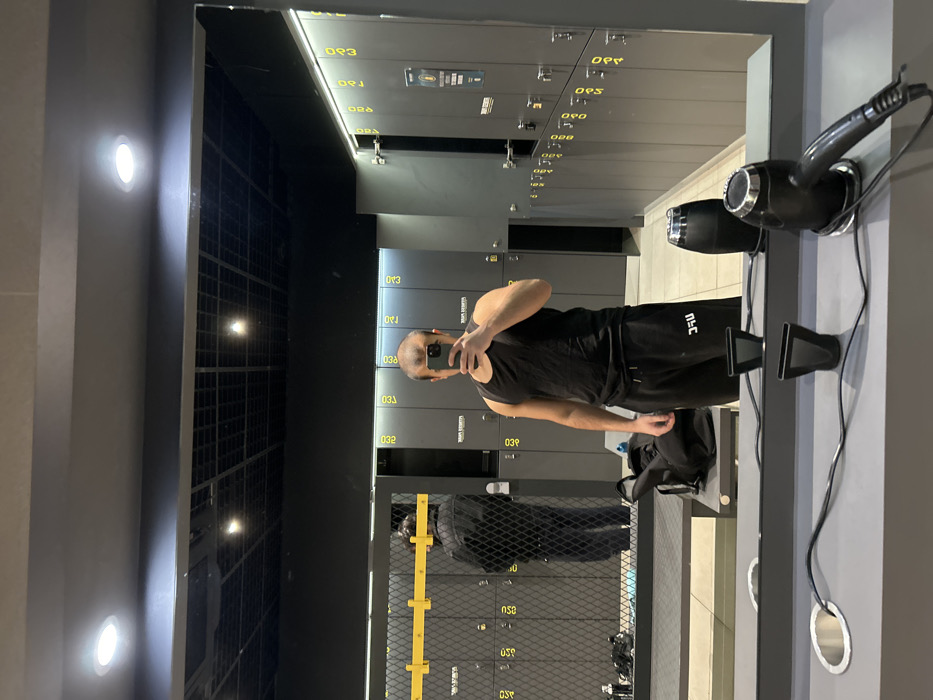 A male individual with a shaven head is depicted taking a mirror selfie in a locker room located in Schiltigheim, France