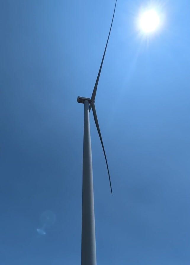 A wind turbine is seen from below against a clear blue sky with the sun high above