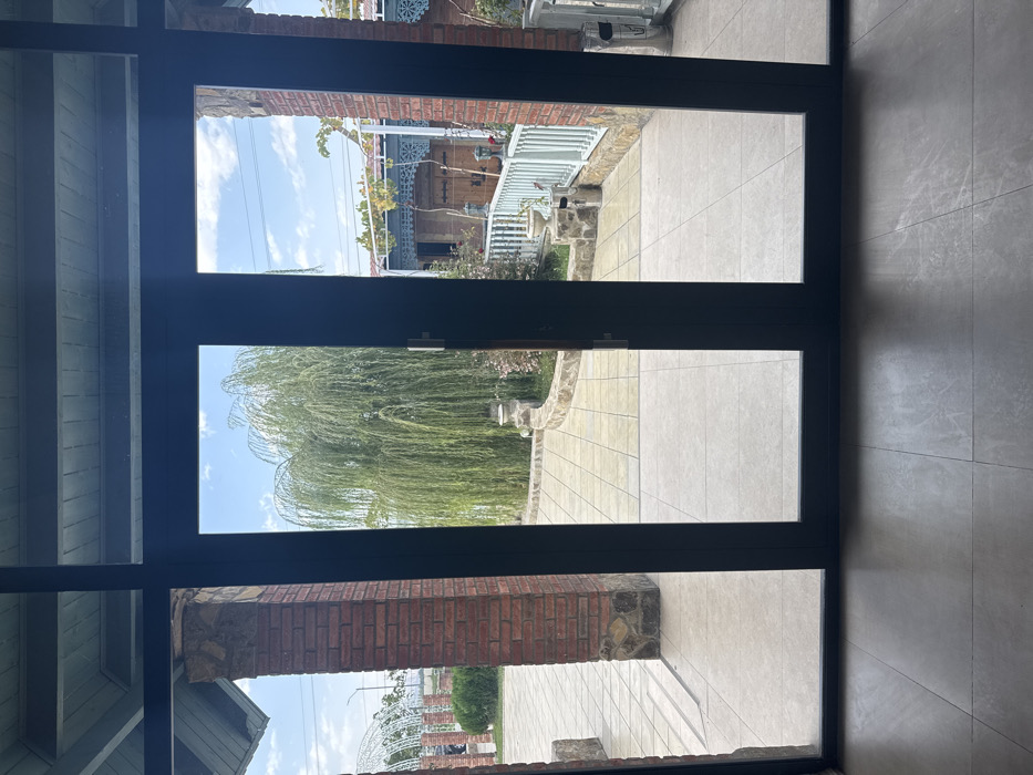 The image displays an exterior courtyard scene viewed through dark-framed glass doors from an interior tiled floor in Kvakhvreli, Georgia. The interior floor is composed of light-toned square tiles. The glass doors are segmented vertically into three main panes by dark mullions and horizontally by a transom, providing a clear view of the sunlit outdoor area. Two substantial brick pillars, featuring stone accents at their bases, frame the central view, supporting a light-colored roof structure with visible rafters. The courtyard's ground surface is paved with light-colored square tiles. Centrally positioned is a large weeping willow tree with dense, verdant foliage, situated within a raised garden bed outlined with stone coping. To the left of the central view, beyond the leftmost brick pillar, a white, ornate metal archway is partially visible. To the right of the weeping willow, a white picket-style railing encloses a garden area populated with various green plants and small red flowering plants. A cylindrical metallic waste receptacle is visible near the railing on the right. In the background, a building with a distinctive blue, intricately carved wooden facade and a dark wooden door is discernible. Utility wires are visible against the clear blue sky, which features scattered white clouds. No individuals, direct actions, or interactions are depicted in the scene.