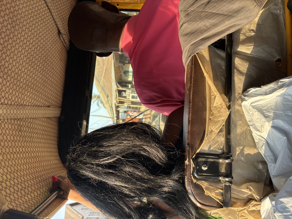 Inside a vehicle, potentially a tuk-tuk, two individuals are visible. The driver, presumably male, wears a pink shirt, his dark skin contrasts with the bright color. A passenger with long, dark hair sits behind. Outside the window, a streetscape with buildings and palm trees is glimpsed, suggesting a sunny, possibly tropical location. A brown seat, with worn protective covering, is situated between the driver and passenger. The photograph is taken at a slightly unusual angle.