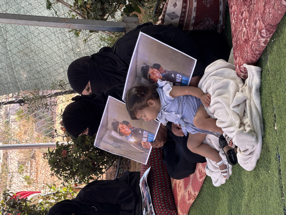 The image depicts an outdoor scene in Carmel, Palestinian Territory. Three individuals, primarily women, are seated on the ground, which is covered with green artificial turf and red and white patterned mats. In the foreground, two women are seated. Both are dressed in black abayas and niqabs, obscuring their faces. The woman on the right holds a young child, approximately a toddler, who is seated on a white blanket on her lap. The child is wearing a light blue and white striped sleeveless romper dress with a collar and bow, and white sandals, and appears to be resting with eyes closed. Both women in the foreground are holding identical printed photographs. Each photo displays a smiling young male with dark hair, wearing a dark top with "NIKE KE" printed in light blue. The subject's face and shirt are speckled with what appears to be white debris, and reddish marks are visible on his cheek. Additional printed materials are visible on the mat beside the woman on the left. The background features a chain-link fence, partially obscured by a green mesh screen or tarp. Sparse vegetation, including bushes with reddish blooms, is visible behind the fence. A light-colored vertical support pole stands near the fence. A red and white flag is partially visible in the far left background.