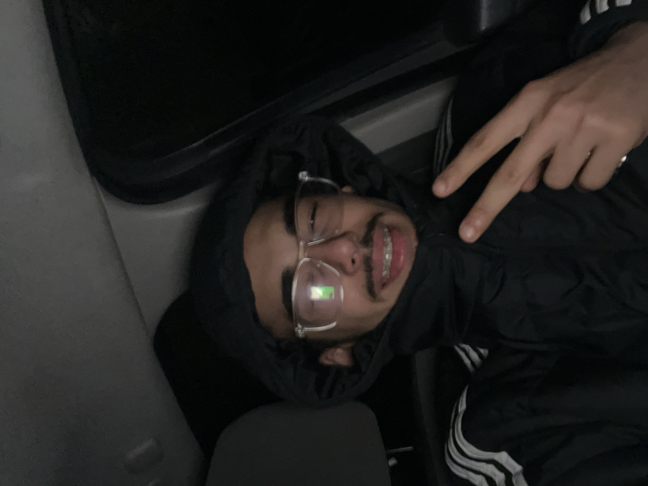 A person wearing glasses and a hooded jacket lies down, possibly inside a car or vehicle. They are smiling and have braces on their teeth. Their hand is raised in a peace sign gesture. The lighting is dim, and the person appears relaxed. The jacket has white stripes on the sleeve.