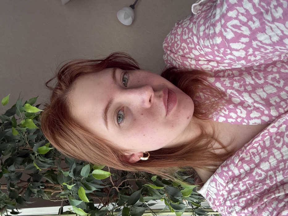 A woman with auburn hair, freckled skin, and green eyes is wearing a pink and white patterned top