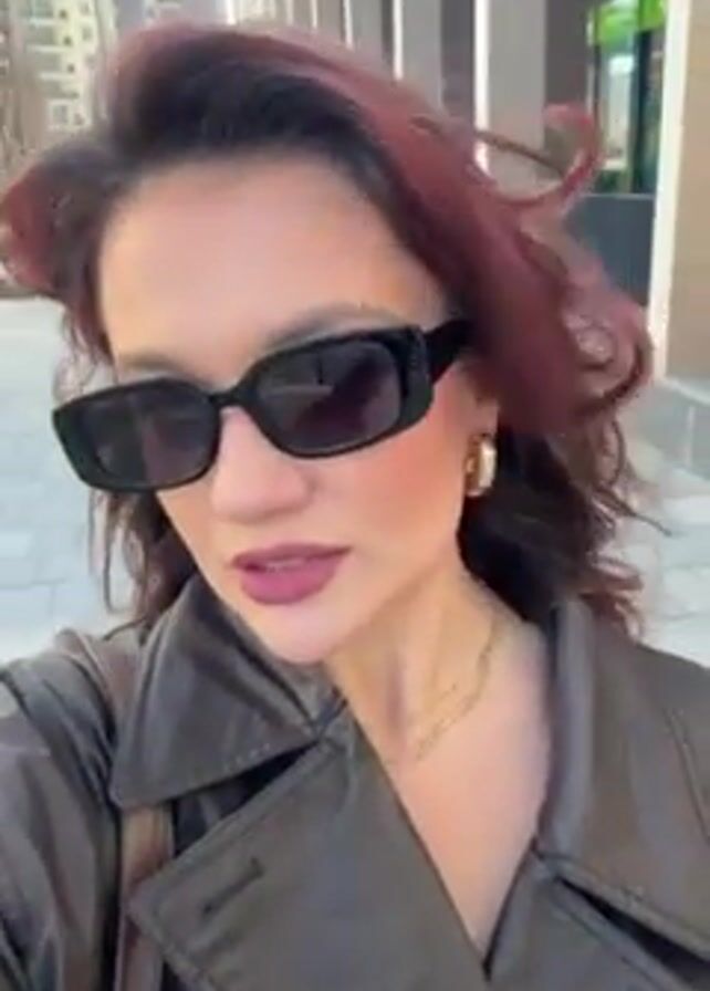 A woman is walking outdoors on a sunny day, likely in a city based on the buildings visible in the background. She is wearing a dark, shiny leather trench coat, black sunglasses, and large gold hoop earrings. She also has a brown leather bag slung over her shoulder. Her hair is short, wavy, and has a reddish-burgundy color. She is wearing a dark red lipstick. The woman is holding the camera herself, creating a selfie-style video. She turns her head to the side and smiles briefly. The buildings around her are modern, with a combination of glass and concrete facades. The street appears to be a pedestrian walkway, paved with light-colored stones. There is also some greenery visible in the background.
