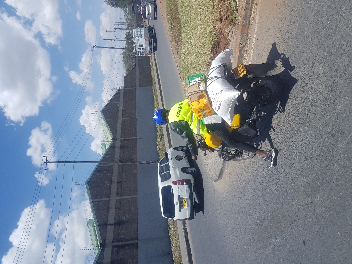 The image captures an outdoor daytime scene on an asphalt road in an industrial or commercial sector of Nairobi, Kenya