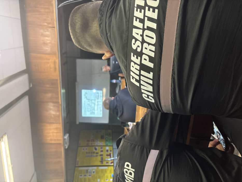 The image captures an indoor training or briefing session from a rear perspective, focusing on two attendees in the foreground. The individual on the right wears a black uniform jacket with "FIRE SAFETY CIVIL PROTECTION" printed in white capital letters across the upper back, above a horizontal grey reflective strip. The person on the left wears a similar black uniform jacket with "МВР" (the Bulgarian abbreviation for Ministry of Interior) printed in white capital letters on the upper back, also above a grey reflective strip; this individual is actively viewing content on a smartphone. Multiple other individuals are seated at wooden tables in rows, facing a large white projection screen at the front of the room. The screen displays a black-and-white diagram, appearing to be a floor plan or technical schematic, illuminated by a projector beam. A presenter or instructor is partially visible to the right of the screen. The left wall features several yellow informational posters or charts containing pictograms and text. The room's architecture includes wooden paneling along the upper walls, lighter-colored walls below, and a ceiling fitted with exposed fluorescent light fixtures and acoustic panels. A plastic water bottle is present on a table in the mid-background. Given the prominent "МВР" and "FIRE SAFETY CIVIL PROTECTION" insignia on the uniforms, the location is identified as a training or meeting facility affiliated with the Ministry of Interior (МВР) or its General Directorate Fire Safety and Civil Protection, situated in Sofia, Bulgaria.