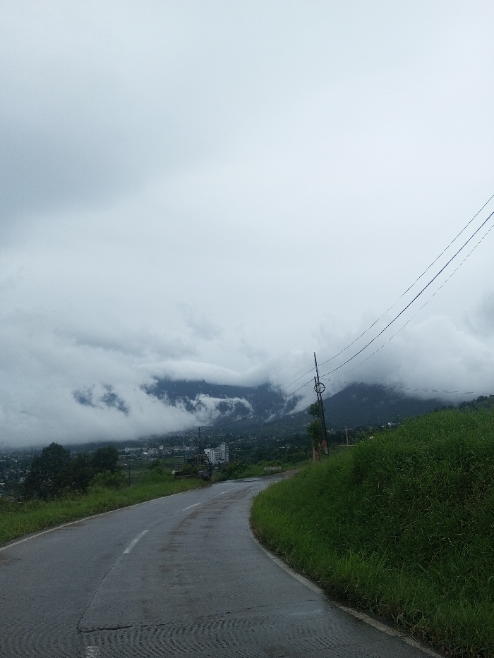 A wet asphalt road curves slightly to the right in the foreground, featuring a faded white dashed center line and textured patterns on its surface, situated in Babaliya Mal., India. A dense embankment of tall green grass occupies the right side of the road. A utility pole with multiple overhead power lines stands on the right midground. In the valley below and extending into the midground, a town or settlement is visible, characterized by various buildings including a prominent multi-story white structure, interspersed within green tree cover. The background is dominated by large, green-covered mountains, partially obscured by heavy, low-hanging grey clouds. The sky is overcast. No individuals or vehicles are present.