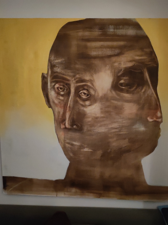 The artwork presents a contorted human head against a backdrop that transitions from yellow to white. The head itself is rendered in brown hues and appears to be a composite of two faces, with misaligned eyes and noses, creating a distorted, surreal effect. The brushstrokes are visible, adding a tactile quality to the artwork. The overall impression is one of unease and disorientation.