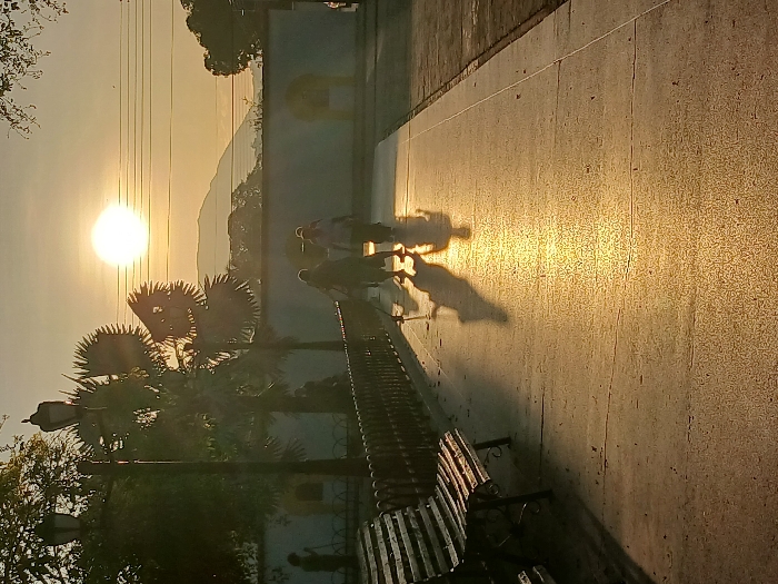 An outdoor scene in Tinaco, Venezuela, is depicted during golden hour, likely sunrise or sunset, with a low sun casting long shadows. The foreground features a wide, light-colored paved pathway, illuminated with a warm, golden hue. To the left, a dark wooden slatted bench with scrolled metal supports is partially visible, adjacent to a dark metal fence or railing. Behind the bench, a tall, dark streetlamp with two lanterns stands. Two individuals walk abreast along the pathway towards the viewer, their figures largely silhouetted, casting prominent, elongated shadows ahead of them on the brightly lit path. Further to the left, a third individual, partially obscured by foliage and a tree, appears to be holding a long object, possibly a broom or tool. Behind the streetlamp and fence, several palm trees are heavily backlit, their fronds splaying out. A light-colored wall with multiple arched recesses or decorative indentations extends horizontally across the midground. Overhead wires are visible against the sky. In the distant background, a mountain range is silhouetted against the bright, low sun positioned centrally on the horizon. The sky is clear.