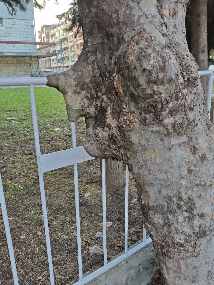 The image presents an outdoor scene in Pomorie, Bulgaria, featuring a large tree trunk in the foreground. The tree exhibits mottled grey-brown bark with areas of peeling and numerous burls. A light grey painted metal fence is partially encompassed by the tree's growth; a horizontal bar of the fence is deeply embedded within the tree's trunk, while several vertical fence bars are visible behind it. The ground in the mid-ground, behind the fence, consists of sparse dry grass, bare earth patches, and scattered small rocks. In the background, multi-story residential buildings are visible, characterized by varied facades including light-colored stone/concrete on the left and pastel-colored (orange, blue, yellow) plaster sections in the center-right. The sky above is bright and lightly clouded. No individuals are present in the scene.