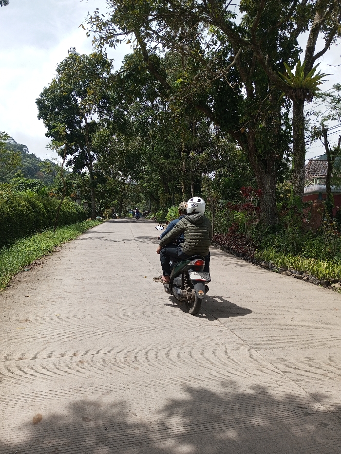 The image depicts a two-lane paved road in Ariyalai, Sri Lanka, extending into the distance under a partly cloudy sky. In the midground, a dark-colored scooter-style motorcycle, bearing license plate 'F 603 NBY', is transporting two individuals away from the viewer. The driver is wearing a white full-face helmet, an olive-green quilted jacket, dark trousers, and sandals. The light-grey road surface in the foreground exhibits textured patterns and shadows from unseen overhead foliage. The road is bordered by dense vegetation. To the left, a continuous line of green bushes and trees leads to distant forested hills. To the right, large, mature trees with extensive canopies line the road, one featuring a prominent epiphytic plant on its trunk. Below these trees, a landscaped strip with varied plant life, including reddish foliage, is visible. Further along the road, two additional motorcycles, each carrying occupants, are in motion, following the same direction. Partially visible through the trees on the right side are buildings with tiled roofs.