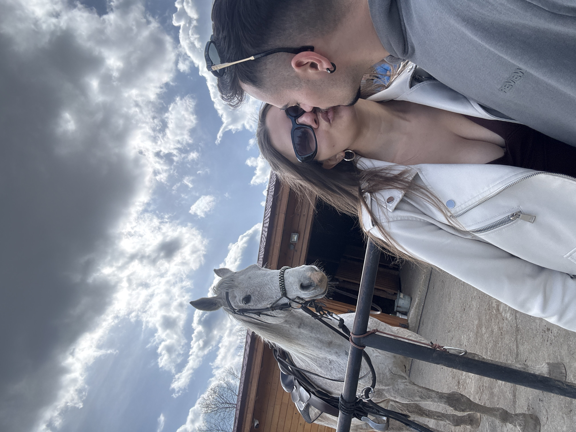 The image, likely taken in Kovachevtsi, Bulgaria, captures a couple kissing in an outdoor setting. A light-colored horse with a saddle and bridle is tethered to a dark metal fence, positioned in the foreground. The couple, wearing sunglasses, are in the upper section of the image. The woman wears a white jacket. The man is dressed in a grey sweatshirt. In the background, there is a wooden structure, possibly a stable or barn. The sky, filled with clouds, is visible above.