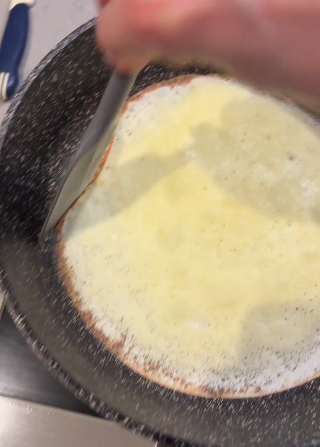 A person is cooking a thin pancake or crepe in a non-stick frying pan on a cooktop