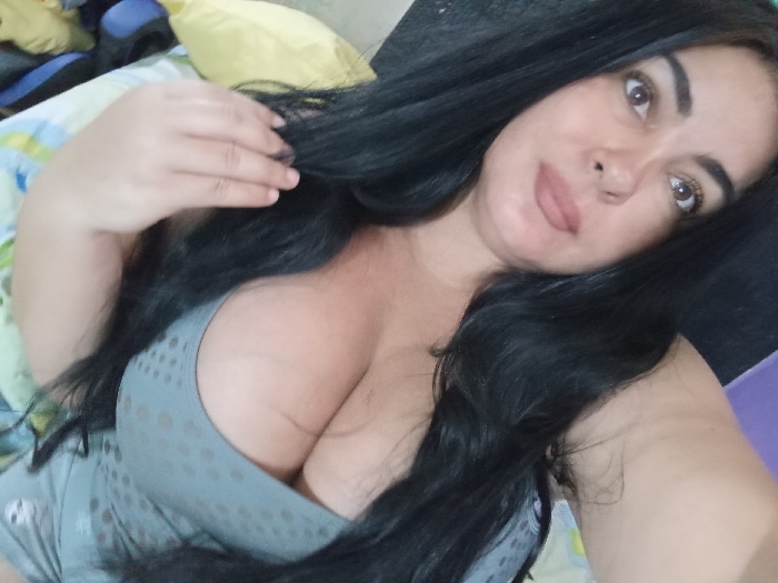 A close-up, selfie-style image shows a single female subject positioned indoors. The subject has long, dark, wavy hair extending over her shoulders and chest. Her face is slightly tilted, with brown eyes looking directly at the camera. She exhibits dark, defined eyebrows and full lips with a light-colored lipstick. Her visible right hand is placed near her head, touching her hair. She is dressed in a light gray, low-cut garment, likely a tank top or camisole, featuring a pattern of darker gray circular dots, which reveals significant cleavage. The background elements indicate an indoor setting, possibly a bedroom, with a light yellow pillow and blue and white striped or patterned bedding visible behind her. A dark, indistinct object is present on the right, with a partial purple object also visible on the far right. The specific location within the city of Juan Griego, Venezuela, cannot be ascertained from the visual evidence presented in the image.