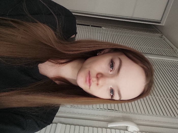 A frontal portrait depicts a female individual in an interior room within the city of Unknown, Unknown. The subject is a female, appearing to be in her late teens or early twenties, with long, straight light brown hair, fair skin, and light-colored eyes accented with visible eyeliner. She wears a dark, possibly black, long-sleeved top and a small, metallic earring in her left earlobe. Her facial expression is neutral. In the background, to the subject's left, a section of a light-colored wardrobe or cabinet with a silver-colored frame is visible. To the subject's right and behind her, a window covered by closed, light-colored horizontal blinds is present. A white, curved handle is affixed to the right side of the window or wall structure. The subject is stationary, facing the camera.
