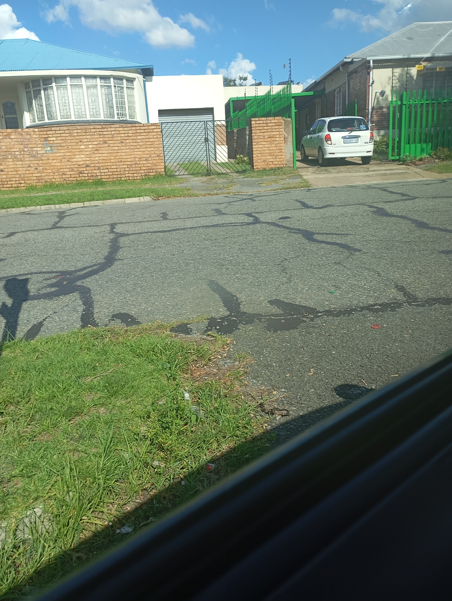 The image depicts a residential street scene. Two houses with brick walls and green fences stand on either side of the frame, and a white car is parked in the driveway of the house on the right. A patch of grass and a cracked asphalt road are in the foreground. Debris is scattered in the grass. The image appears to be taken from inside a car, as part of the car door is visible in the foreground. Based on architectural styles, building materials and the license plate on the car, the location is consistent with a residential area in Johannesburg, South Africa.