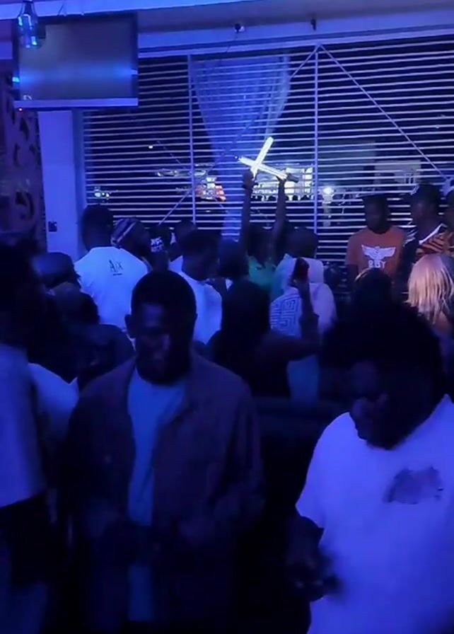 dimly lit bar with a crowd of people dancing. Most of the people are dark-skinned. The lighting alternates between blue and green. A person in the middle of the crowd holds a white object that resembles a cross. The crowd is loosely packed and some people are facing the camera while others are facing away. There is a flat screen TV mounted on the wall and a set of blinds covering a window in the background. The bar appears to be indoors.