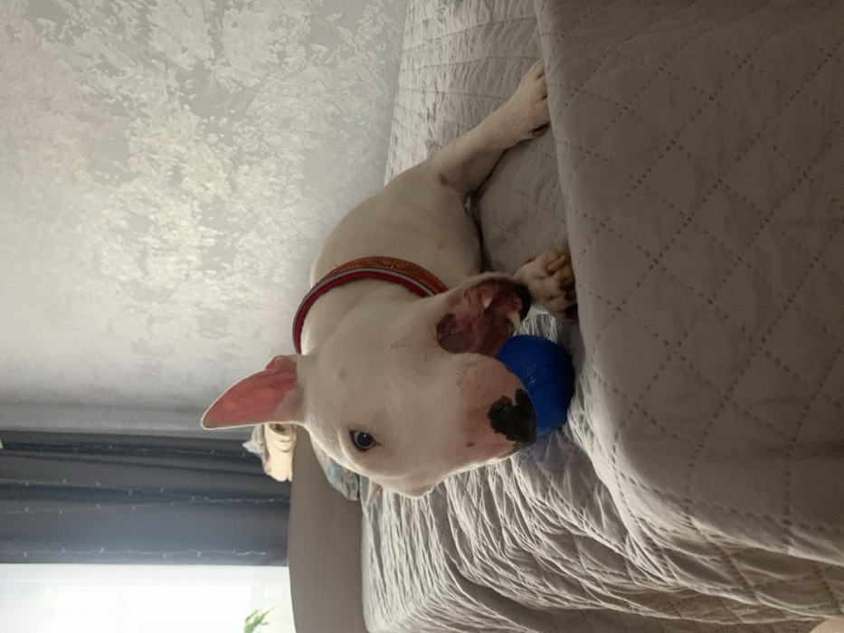 The scene is an indoor residential setting. A white Bull Terrier dog, wearing a red and orange collar, is depicted lying on a gray quilted bedspread. The dog is positioned on its left side, actively biting a small, solid blue ball with its mouth open, exposing teeth. Its right front paw is visible near the ball. The background features a light-colored, textured wallpaper, and dark curtains are visible on the left, partially covering a window. No visual identifiers within the image confirm its location as Chaikovsky, Russia.