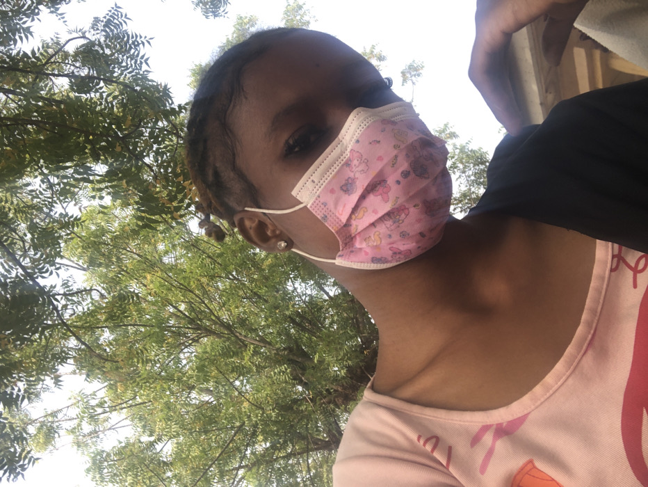 An individual, likely a young female, is depicted in an outdoor setting in Dutsinma B, Nigeria. Her face is partially obscured by a light pink disposable surgical mask featuring cartoon characters, covering her nose and mouth. She wears a light pink short-sleeved top with white and orange graphic elements, and a dark garment is visible over her left shoulder. Her hair is styled in braids with laid edges, and a small stud earring is present in her visible left ear. She looks directly towards the camera, which is positioned at a low upward angle. The background consists predominantly of dense green tree foliage against a bright, clear sky. A light-colored structural element is partially visible in the bottom right corner.
