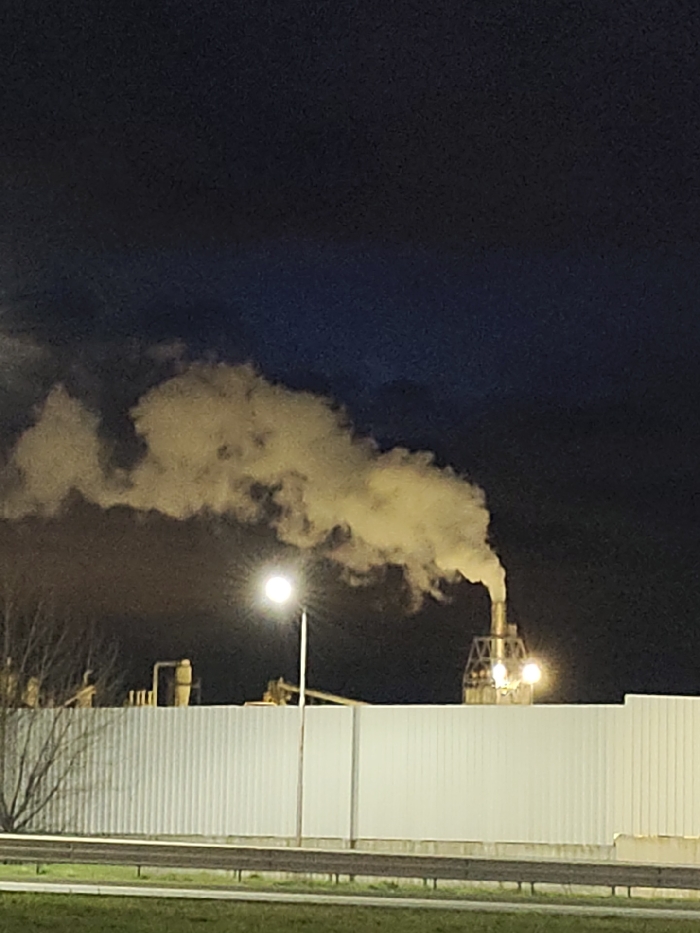 The image depicts an industrial scene at night in Burgas, Bulgaria. A voluminous plume of yellowish-white smoke or steam emanates from a tall, light-colored industrial stack, extending horizontally across the frame against a dark, deep blue night sky. The stack's base is integrated into a multi-level metallic framework, illuminated by several bright, circular artificial lights. In the mid-ground, a prominent white corrugated metal barrier fence runs horizontally, separating the foreground from the industrial facility. Visible above and behind this fence, particularly to the left of the main stack, are additional industrial structures including what appear to be storage vessels, various pipes, and large yellow machinery components. A bare deciduous tree with dark branches is partially visible to the far left, behind the fence. A single, illuminated street lamp on a pole stands in the mid-left of the frame, emitting a bright, spherical white glow that partially illuminates the smoke plume. Below the fence, a strip of green grass is visible, followed by a dark roadway surface or shoulder, separated by a light-colored metal guardrail that runs parallel to the fence. No people or specific interactions are visible within the scene.