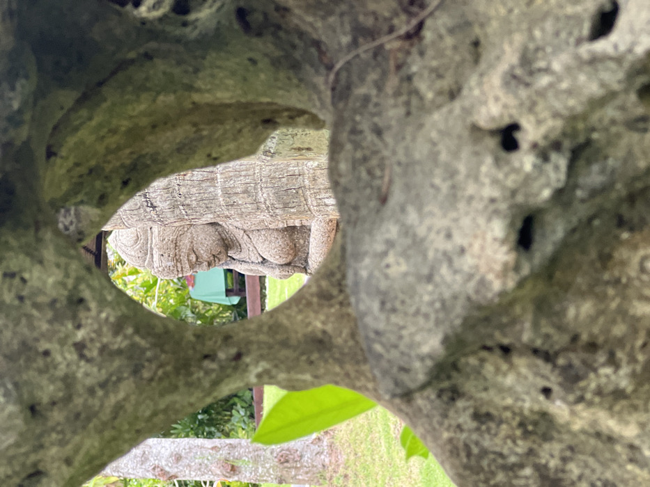 A close-up, eye-level shot focuses through a hole in a textured, gray object, possibly a tree trunk or sculpted stone. The rough surface surrounding the hole is detailed with dark pockets and mossy patches. Through the opening, a glimpse of a stone statue, seemingly resting its weight on its arms, is visible, with a blurred background of green foliage and a teal structure. The foreground and background elements create a layered composition with contrasting textures.