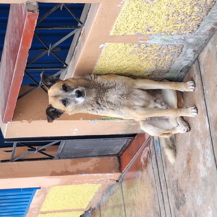 A tan and light brown dog sits sideways on a tiled surface, its front paws extending towards the viewer. The dog has a black ear and a short tail. A wall with yellow, orange, and red paint is visible behind the dog. A blue metal gate is also present in the background. The overall scene appears to be outside.
