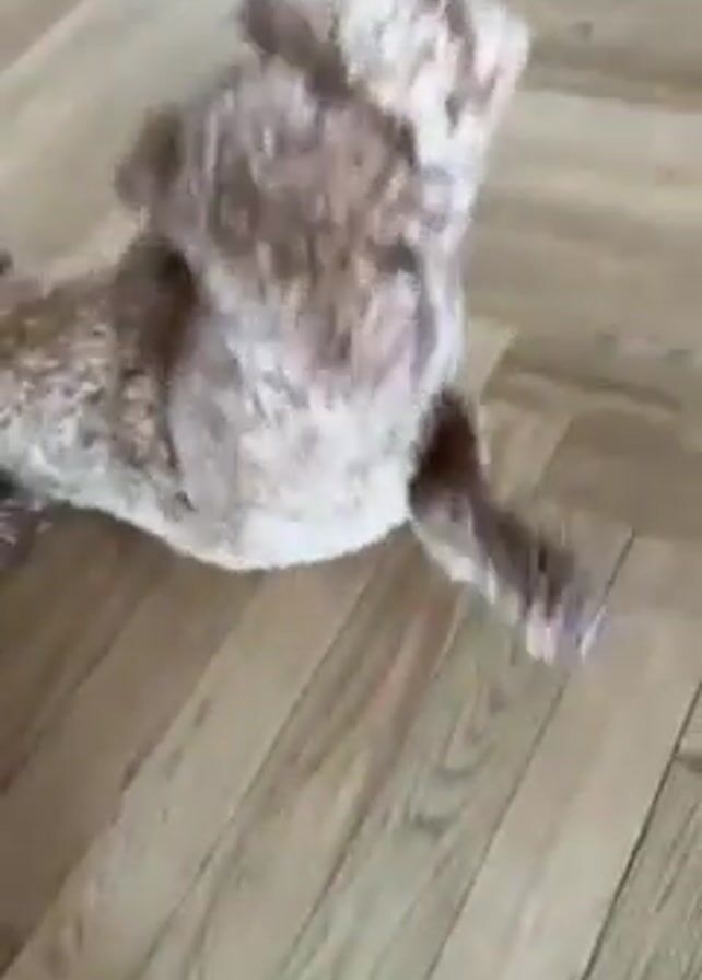 A dog, likely a doodle or poodle mix with light brown curly fur, rolls around on a wooden herringbone-patterned floor
