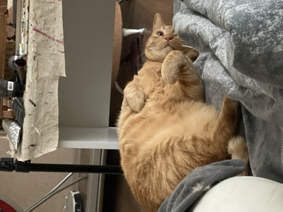 - "The image, captured in an indoor setting within Балаклавский округ, Ukraine, depicts an orange domestic short-haired cat resting on its back on a grey, patterned textile surface" by FM-uK62y1, licensed under CC BY 4.0